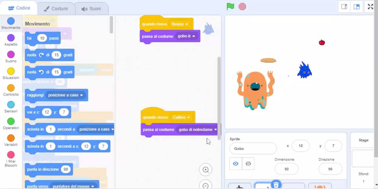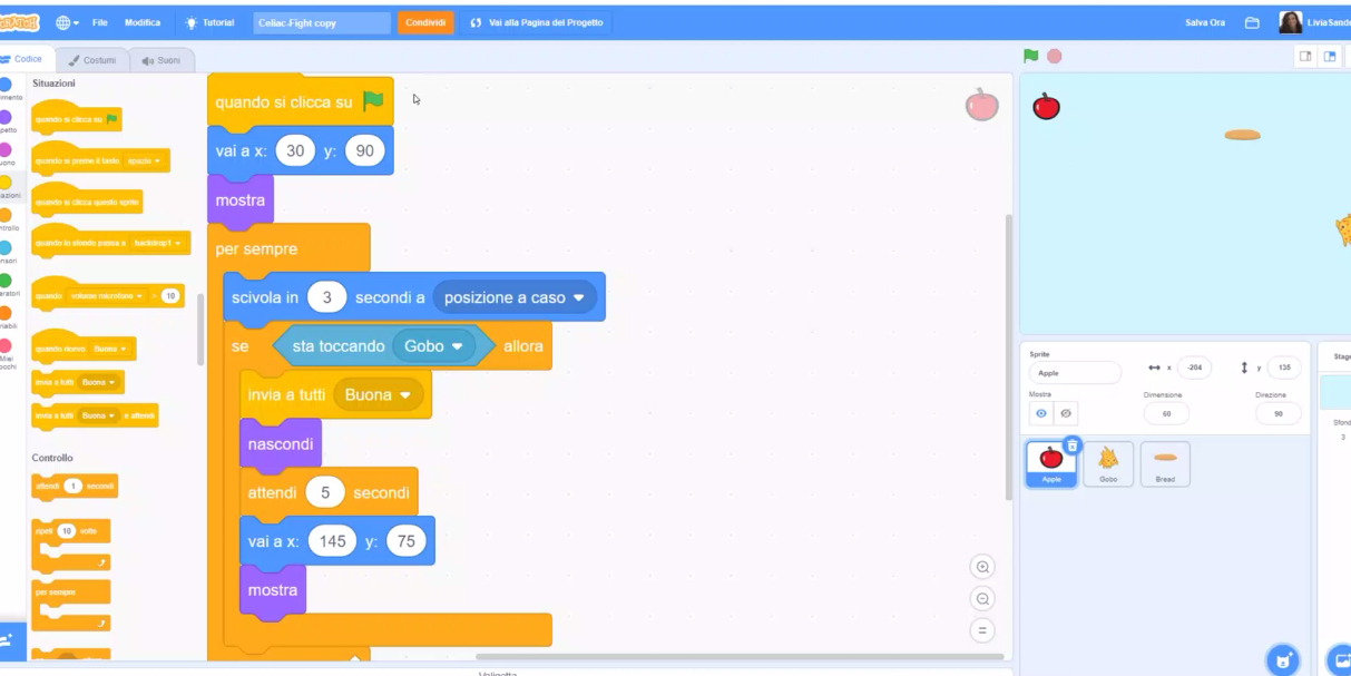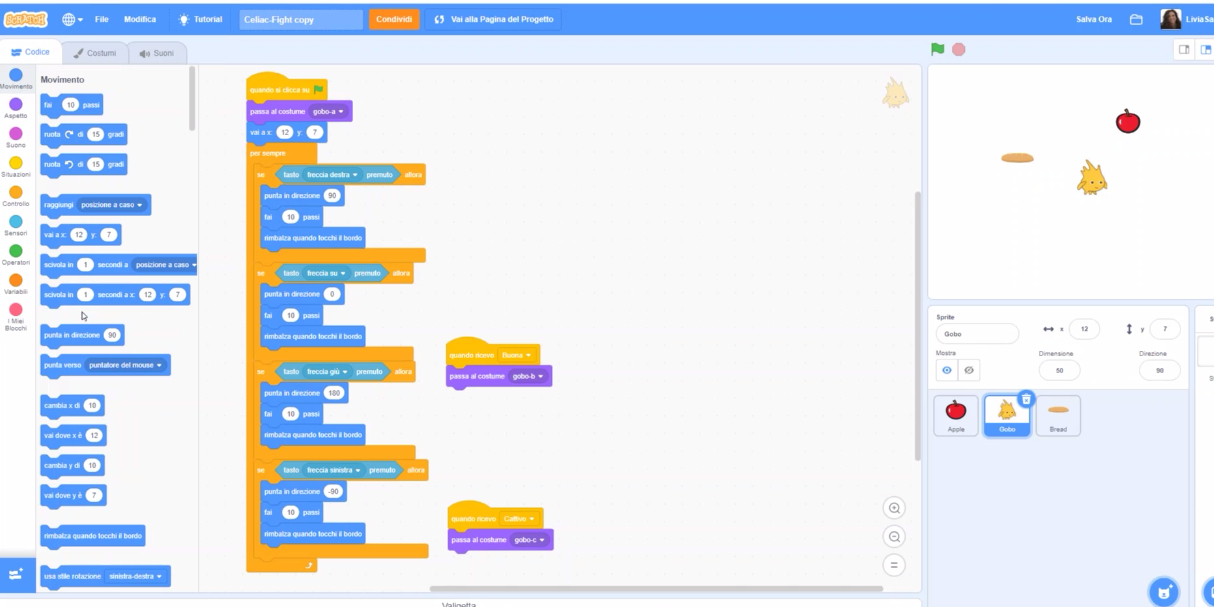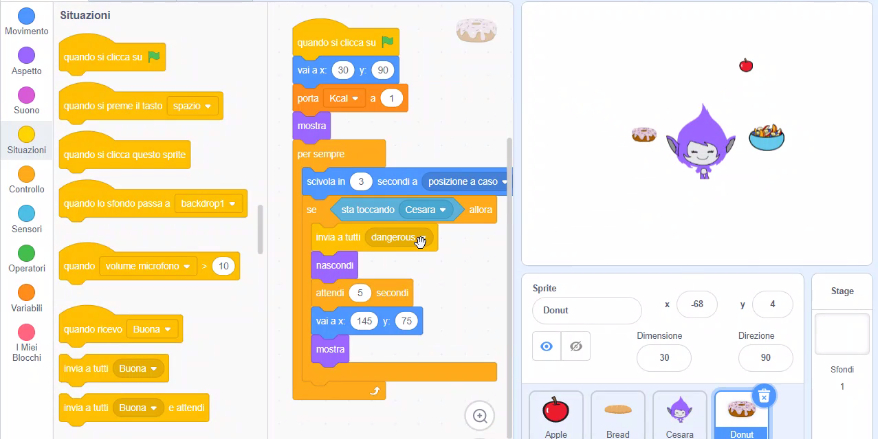 Le classi collegate in videoconferenza hanno seguito l'introduzione dell'esperta che ha illustrato il codice per realizzare alcune fasi di un videogioco sul tema delle intolleranze alimentari. È stato quindi fornito il link per collegarsi al progetto su Scratch già sviluppato dall'esperta ed è stato proposto di realizzare una modifica: ecco che in gruppo ragazze e ragazzi si sono messe al lavoro per esercitare la loro capacità di problem solving, la loro intelligenza logica, la loro capacità di lavoro in gruppo e di programmazione!