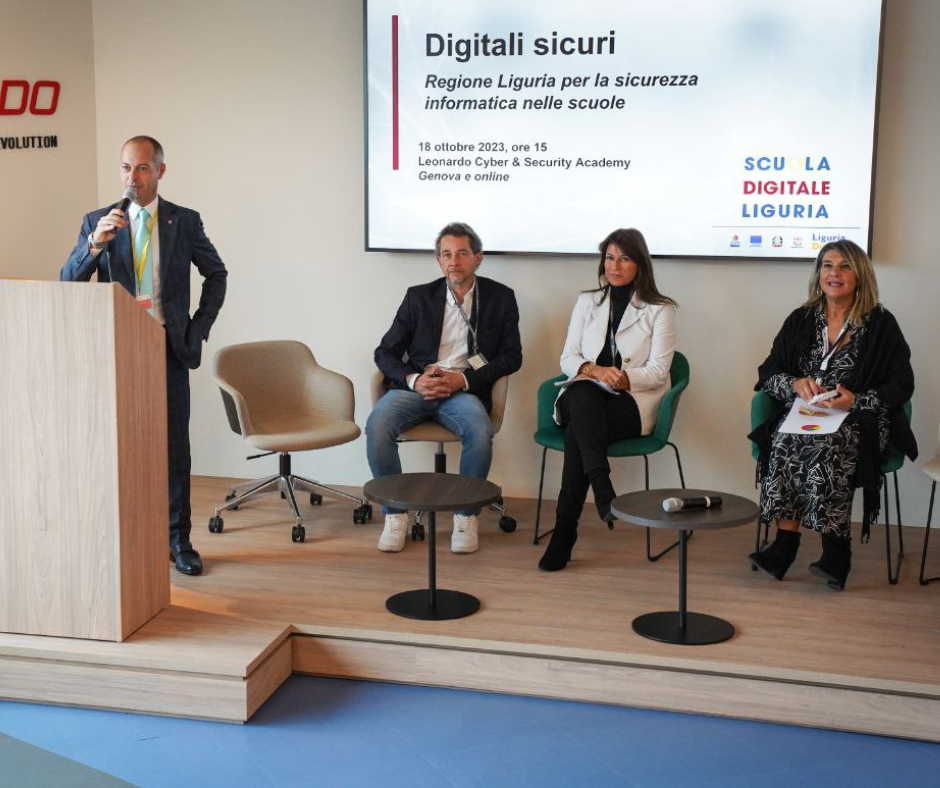 Apertura dell'incontro a cura di Gabriele Moretta, Responsabile Operation Cyber & Security Academy di Leonardo, Simona Ferro, Assessore Scuola e Università di Regione Liguria, Alessandro Curioni, professore universitario, Presidente DI.GI. Academy, Omar Losi, Head of Cyber Security Risk Management di Plenitude e Monica Cavallini, PM di Scuola Digitale Liguria.