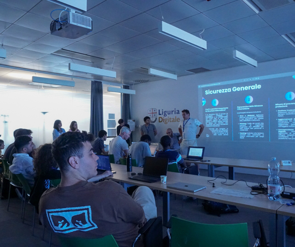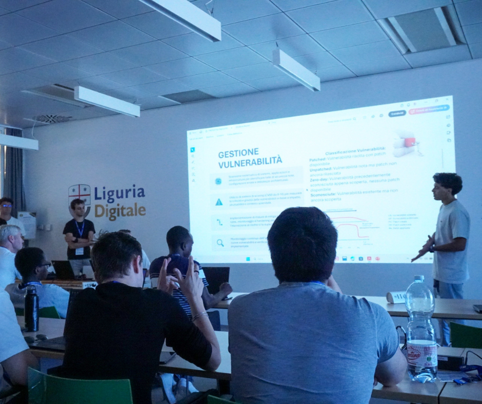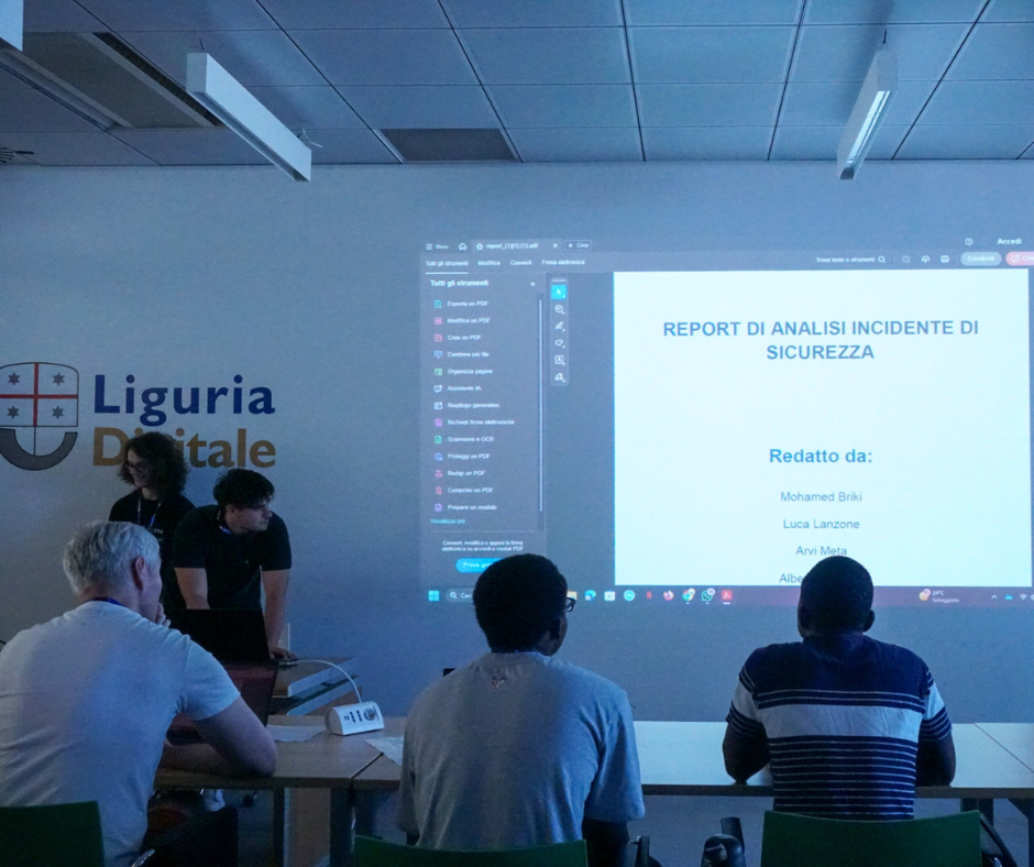 Durante la mattina, i ragazzi e le ragazze del corso per specialisti in sicurezza di sistemi e reti di Accademia Digitale Liguria ITS-ICT, affiancati e seguiti dai tecnici di Liguria Digitale - Mirco Massone, Federico Ciminelli e Davide Bartolozzi - hanno presentato i lavori realizzati durante l’esperienza.