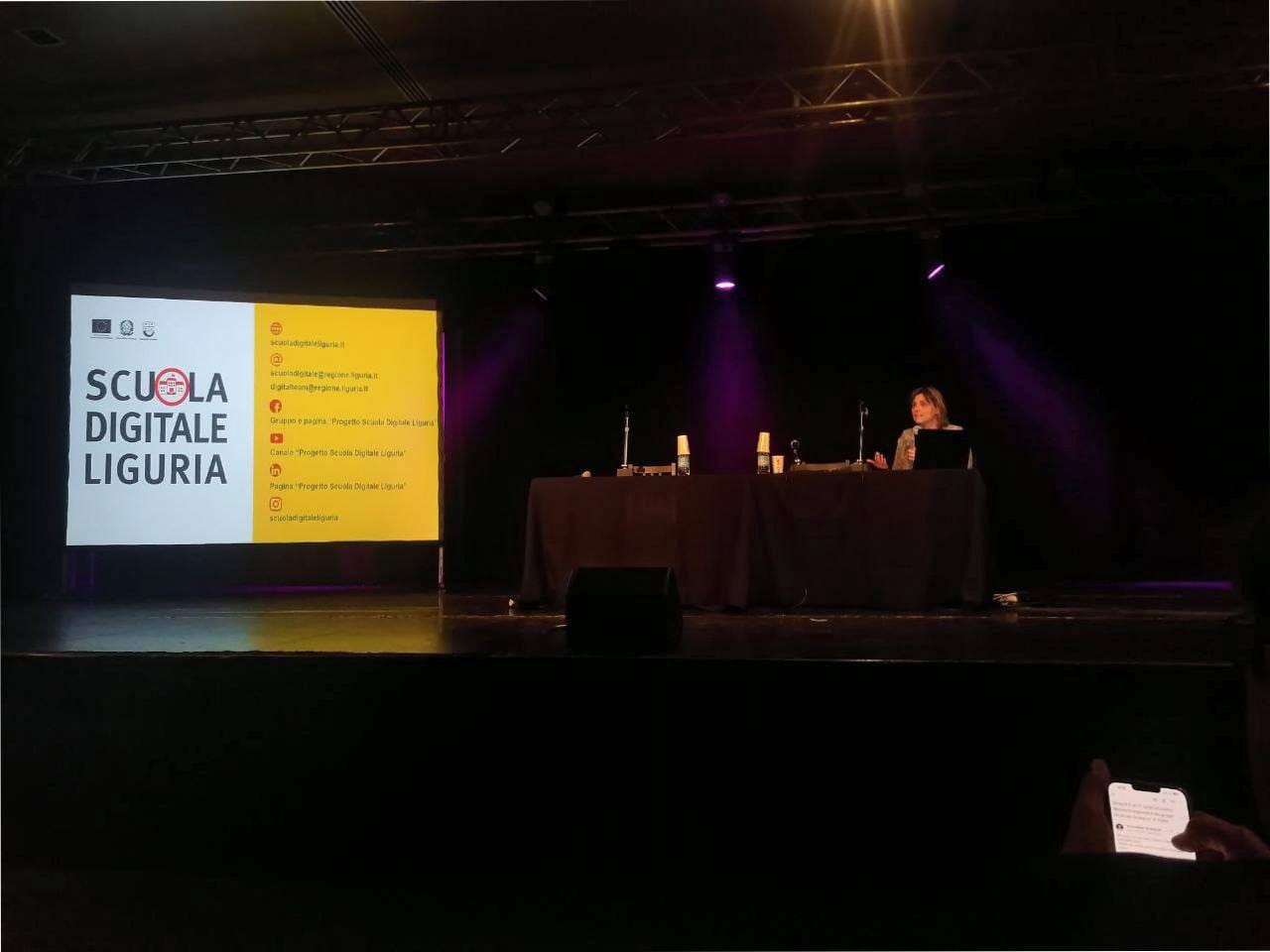 Dopo i saluti istituzionali dell'assessore Marta Brusoni i lavori sono proseguiti con gli interventi dei relatori, fra cui quello di Scuola Digitale Liguria, tenuto dalla PM Monica Cavallini e dalla consulente metodologico-didattico Angela Maria Sugliano: "Progetto Scuola Digitale Liguria: supporto e opportunità per un’innovazione consapevole".