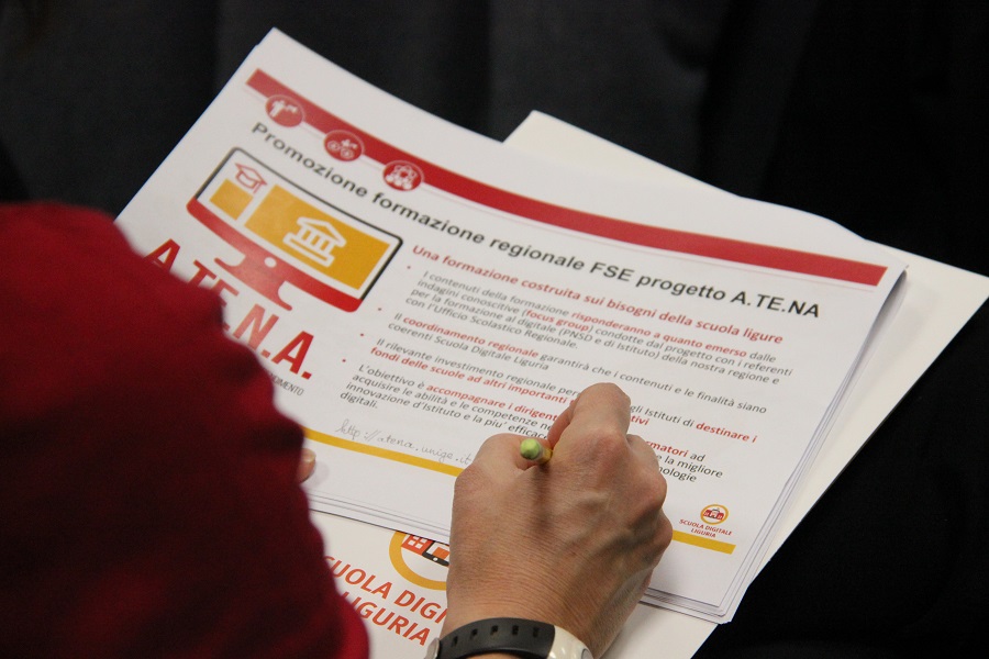 "Fondamentale per perseguire la crescita dell’innovazione tecnologica nelle scuole è la formazione". Ecco il focus dell’intervento di Giovanni Gimelli, referente dell'Ufficio Scolastico di Regione Liguria, aggiungendo che gli interventi formativi devono raggiungere un numero sempre più elevato di docenti e personale scolastico in generale. Questa è l'impostazione regionale che viene realizzata con il progetto A.TE.N.A., illustrato durante la giornata da Giovanni Adorni, capofila del ATS vincitore dell'avviso. Regione Liguria, tramite il coordinamento con il progetto Scuola Digitale Liguria, assicura la coerenza della formazione erogata sulla base dei bisogni emersi nell'analisi condotta nei focus group propedeutici. A.TE.N.A. si propone di erogare formazione digitale a tutta la filiera della scuola: docenti e formatori IeFP, dirigenti scolastici, direttori IeFP e operatori tecnici.