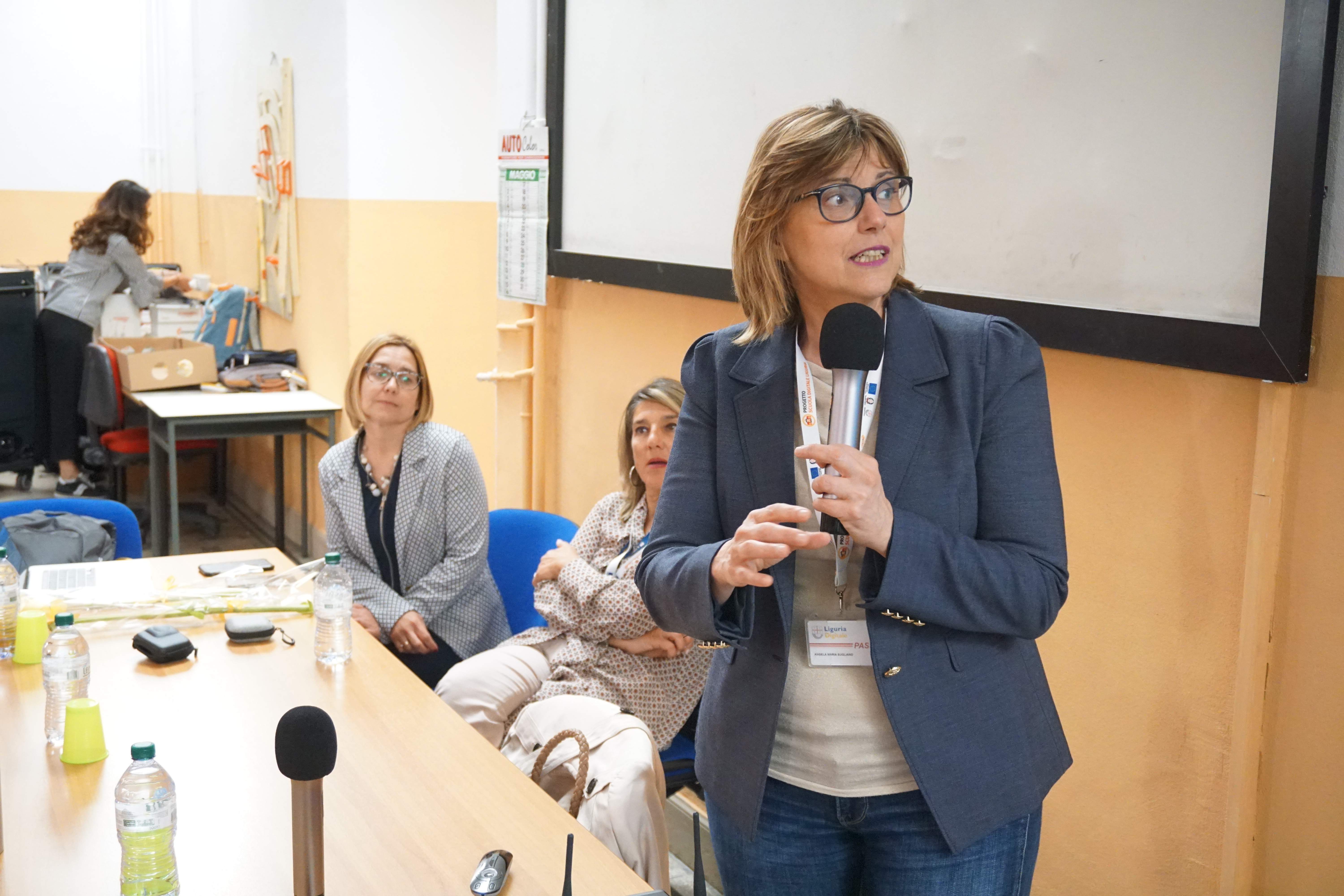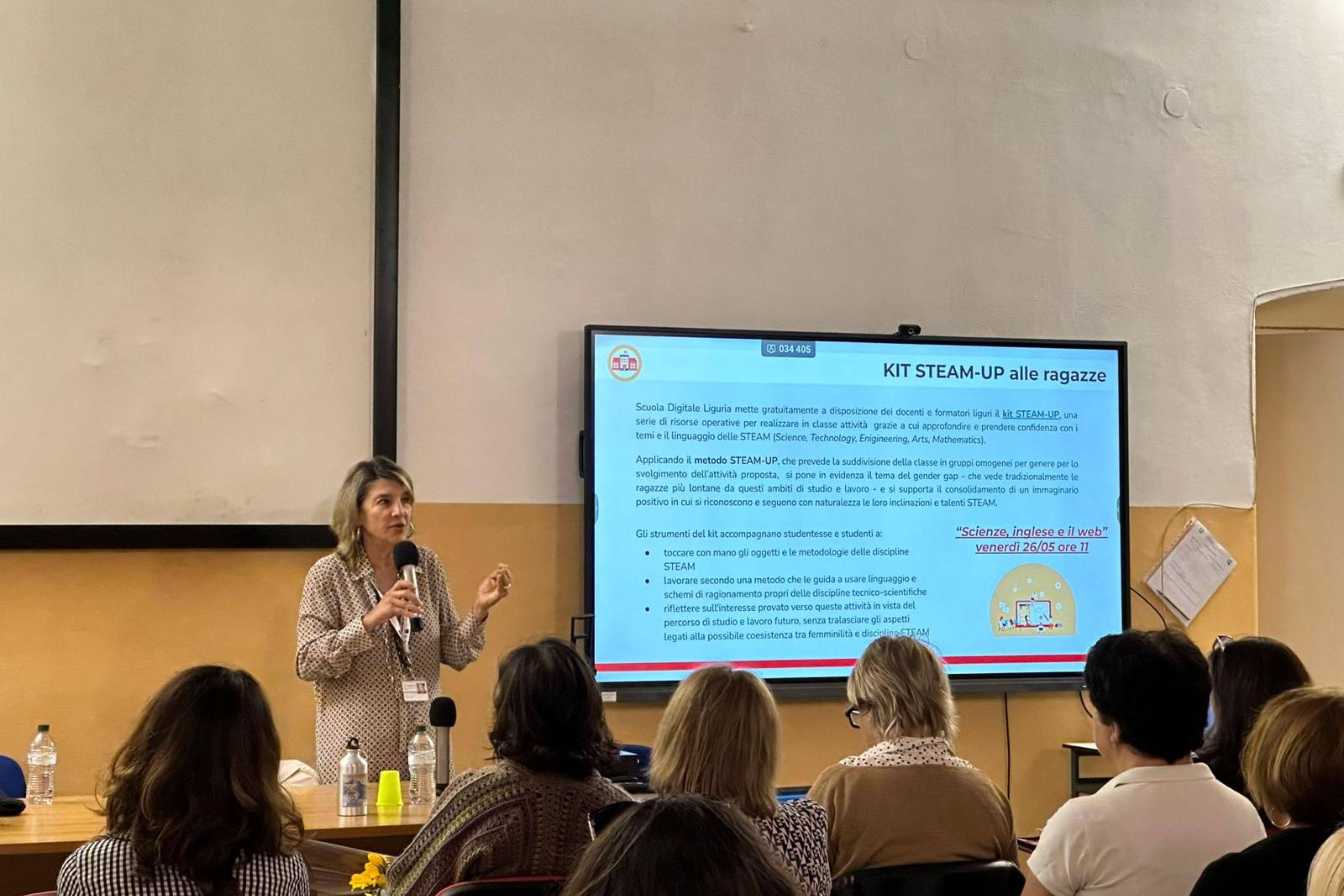 Saluti istituzionali e apertura in plenaria a cura della preside Anna Maria Fogliarini che ha introdotto l'intervento di Andrea Cartotto, ambasciatore sul territorio ligure del progetto. Si è entrati poi nel vivo dell'incontro, con gli interventi di Monica Cavallini, referente del Progetto Scuola Digitale Liguria e di Angela Sugliano: la prima ha presentato il progetto, con focus sul Digital Team e sull'azione STEAM-UP; la seconda - insieme ad Anita Granili - l'Osservatorio dei progetti innovativi e l'importanza della documentazione multimediale.