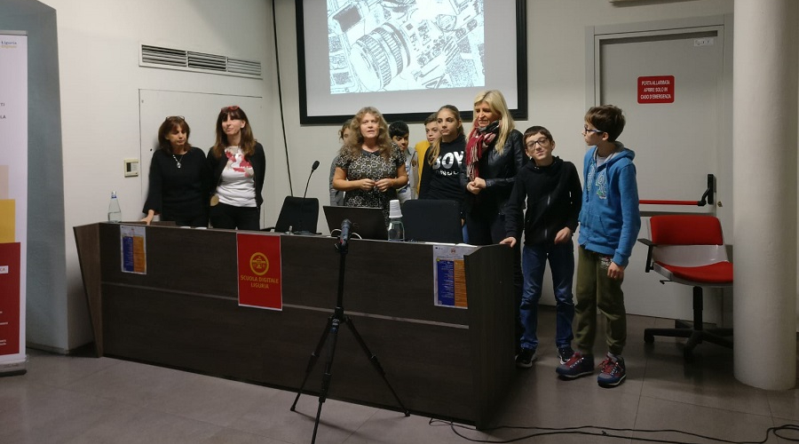 I docenti e gli Istituti con i loro studenti nel workshop del 14 novembre 2019: Franca Aramini e Felicia Rizza - Elvia Bennici e Maria Calderone (I.C. G.B. della Torre - I.C. Castelletto), Claudia Incerti - Sabrina Morando (I.C. Bogliasco-Pieve L.-Sori - I.C. Teglia), Nadia Zamboni ed Elisabetta Nano - Monica Colombo e Silvia Fazzi (I.C. Cogoleto - I.C. Savona II - Liceo Scientifico Orazio Grassi), Giorgio Gasparini - Gianna Molina (I.C. Cornigliano - I.C. Sanremo Centro Ponente), Giovanni Dodero - Gloria Drei (IISS Liceti - IIS Natta De Ambrosis), Daniele Boni - Elena Nastasi e Patrizia Lombardo (ISIS Parentucelli-Arzelà - I.C. Sestri Levante).