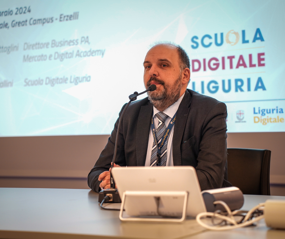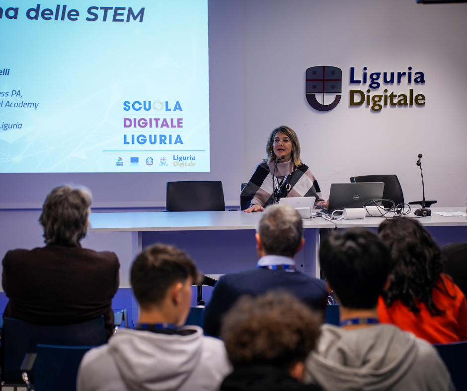 In apertura i saluti istituzionali di Riccardo Battaglini, direttore della Business Unit PA, Mercato e Digital Academy di Liguria Digitale, Monica Cavallini, PM di Scuola Digitale Liguria, Micaela Fodringo di Sviluppo Lavoro Italia, Claudio Novelli di Accademia Digitale Liguria ITS - ICT e della dirigente scolastica dell’Istituto Tecnico Calvino Sandra Voltolini.