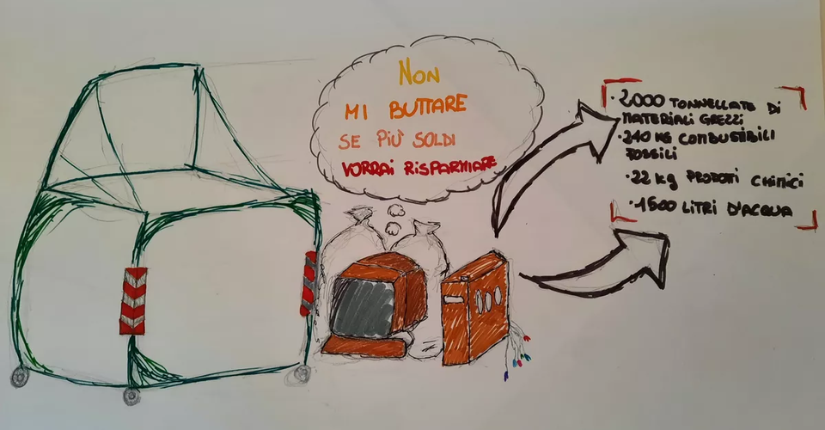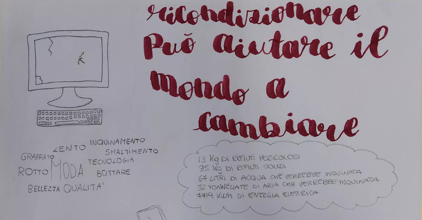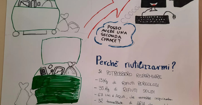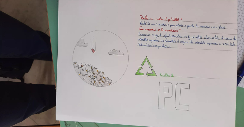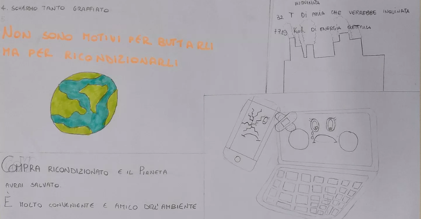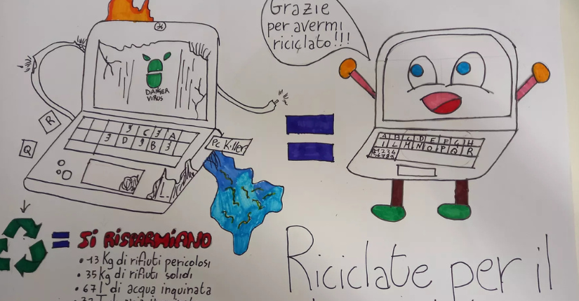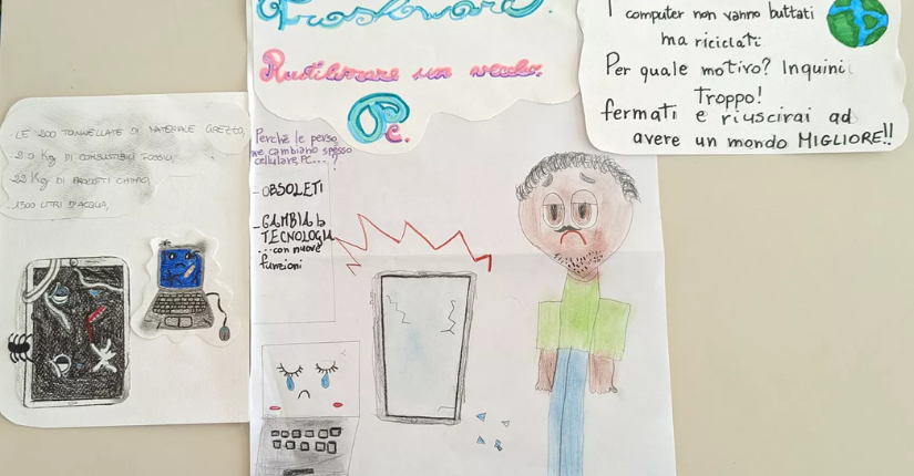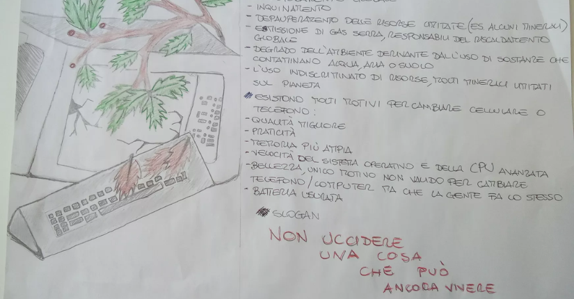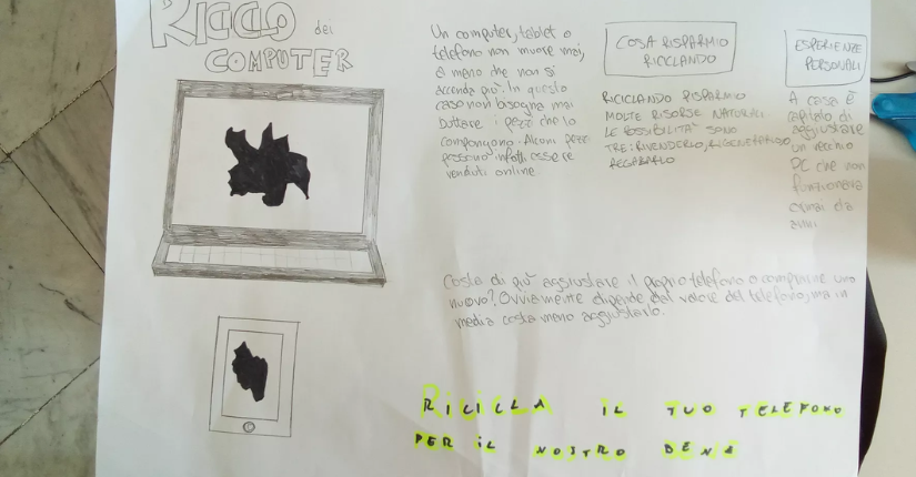 Partendo dall'analisi di un computer nella sua struttura hardware le classi sono state invitate a realizzare un lavoro grafico - modello infografica con testo, disegni e slogan - per rappresentare i costi in termini di materie prime e disponibilità ambientale nello smaltimento di pc, telefoni e tablet.