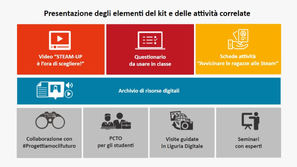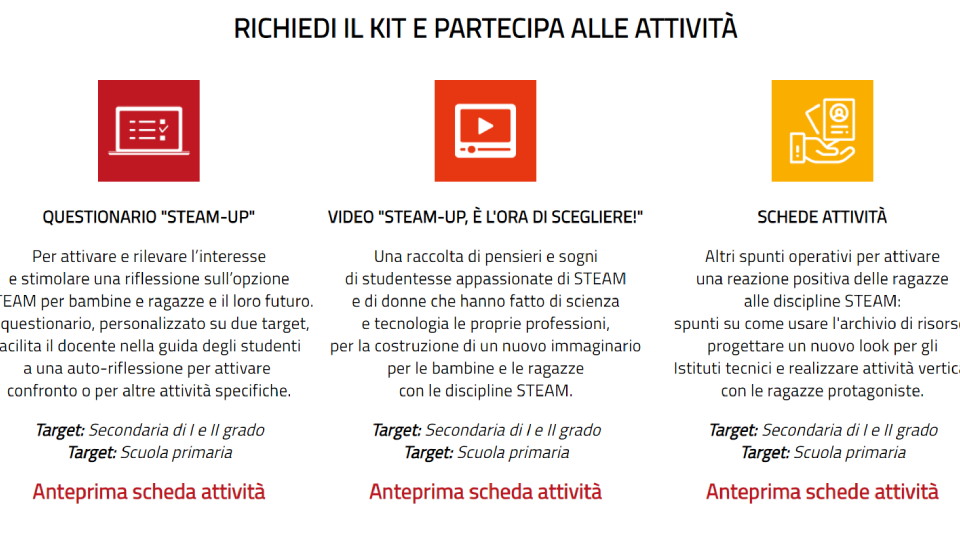 Un questionario per attivare, rilevare e stimolare una riflessione sull'opzione STEAM per bambine e ragazze e il loro futuro, un video per creare un immaginario e abilità con le STEAM anche per bambine e ragazze, schede attività con spunti operativi per attivare una reazione positiva delle ragazze con le discipline STEAM, un archivio di risorse digitali subito disponibili per avvicinare le ragazze alle STEAM e varie attività correlate: questi gli strumenti messi a disposizione da Scuola Digitale Liguria nel kit per le scuole. Per approfondire e richiedere il kit consulta la sezione dedicata (v. approfondimento).