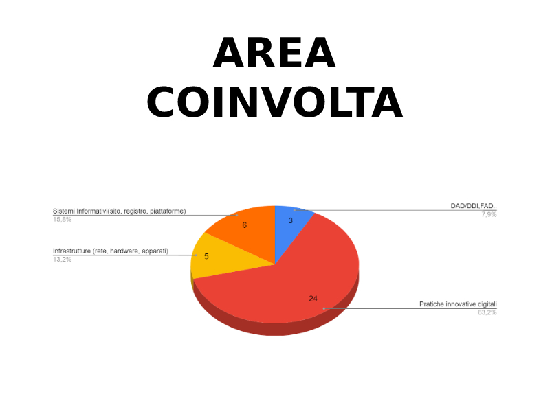 - Area coinvolta > "Pratiche innovative digitali" (63,2%), "Sistemi informativi: sito, registro, piattaforme" (15,8%), "Infrastrutture: rete, hardware, apparati" (13,2%)
