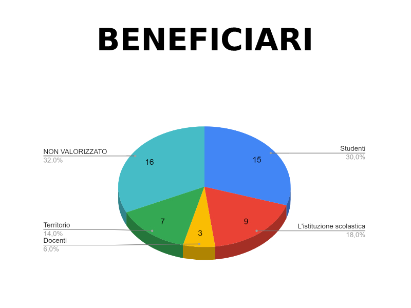 - Beneficiari > "Studenti" (30%), "L'istituzione scolastica" (18%), "Territorio" (14%)