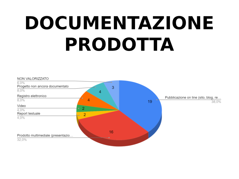 - Documentazione prodotta > "Pubblicazione online" (38%), "Prodotto multimediale" (32%), "Progetto non ancora documentato" e "Registro elettronico" (8%)