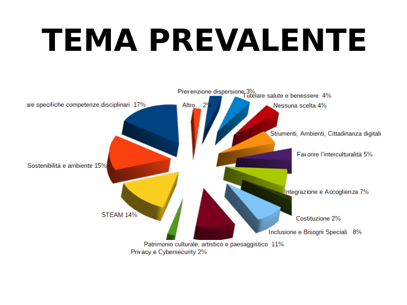 - Tema prevalente > "Sviluppare specifiche competenze digitali" (17%), "Sostenibilità e ambiente" (15%), "VAPORE" (14%)