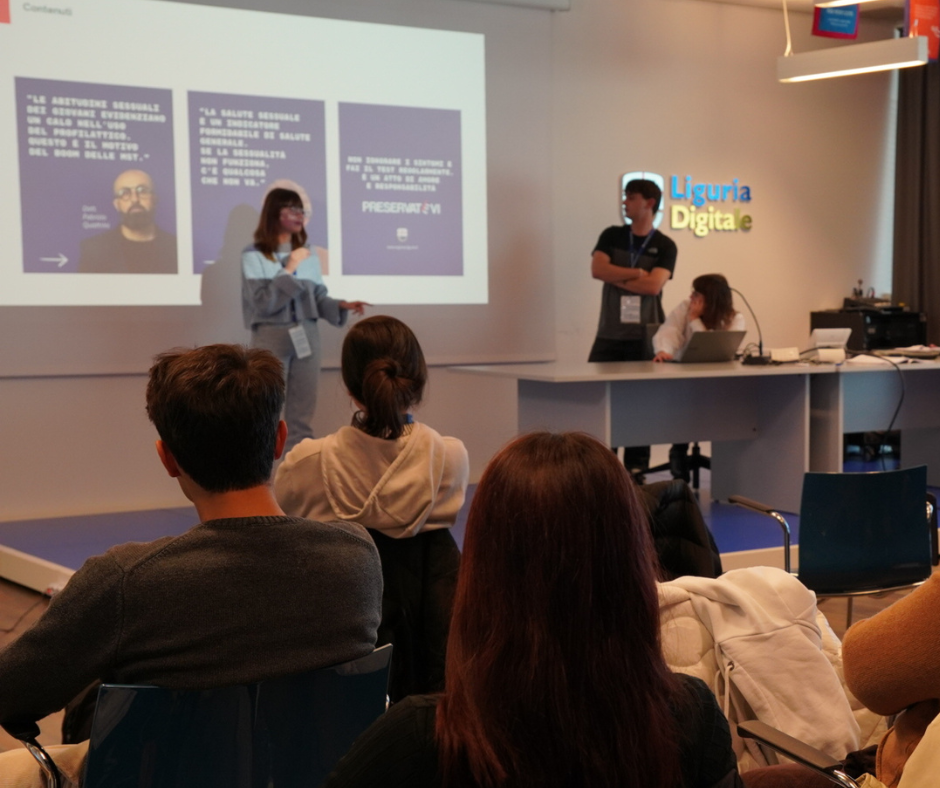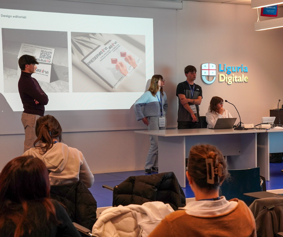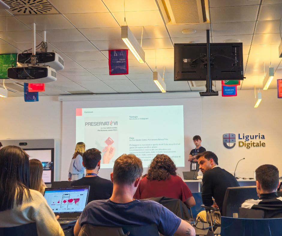 Il Progetto Industriale ha coinvolto la classe del 14.3 in due settimane intense di project work in azienda: affiancati dalle esperte di Liguria Digitale Imma Ciaravolo e Francesca Di Santo, i gruppi hanno sperimentato in prima persona il lavoro di una redazione creativa in ambito sanitario.