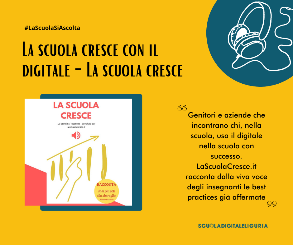 La Scuola Cresce con il Digitale realizzato da Associazione Copernicani. 27 episodi in cui vengono presentate le voci degli insegnanti e le best practices realizzate nelle scuole di tutta Italia, verso una didattica sempre più attenta e digitale.