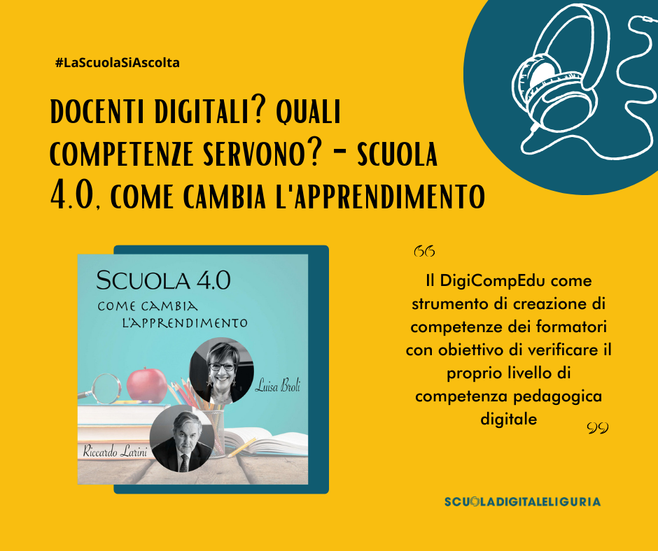 Scuola 4.0 Come cambia l’apprendimento: Docenti digitali? Quali competenze servono? realizzato da Luisa Broli e Riccardo Larini. Il DigiCompEdu come strumento di creazione di competenze per formatori per verificare il proprio livello di competenza pedagogica digitale.